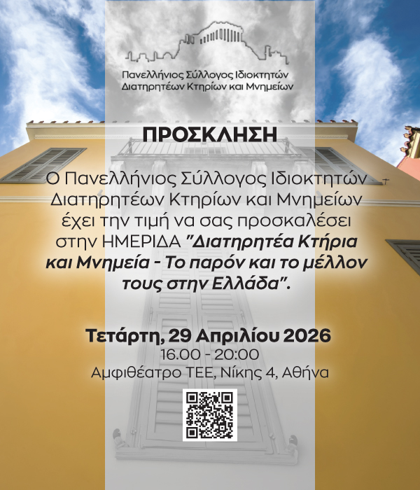 Ο Πανελλήνιος Σύλλογος Ιδιοκτητών Διατηρητέων Κτηρίων και Μνημείων διοργανώνει Ημερίδα την Τετάρτη 29η Απριλίου, 4μμ, στο ΤΕΕ με θέμα: «Διατηρητέα Κτήρια και Μνημεία: Το παρόν και το μέλλον τους στην Ελλάδα».