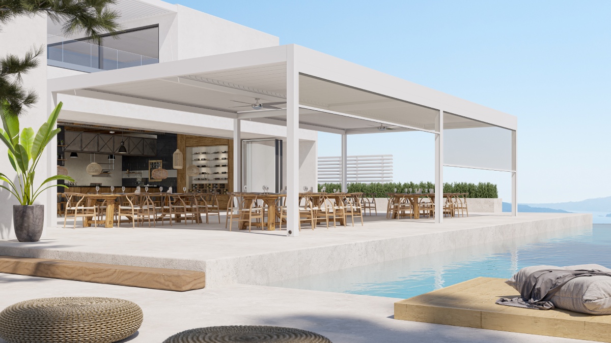 Η SANTORINI είναι μια βιοκλιματική πέργκολα κορυφαίας στιβαρότητας, ιδανική για κατασκευές πολύ μεγάλων διαστάσεων έως 7.2x7.2m, γεγονός που την καθιστά πραγματικά μοναδική. Σε περίπτωση κατοικιών, τμήμα αυλής 50m2 μπορεί να μεταμορφωθεί σε ξεχωριστό χώρο με ελεγχόμενη σκίαση και αερισμό, βελτιώνοντας την ποιότητα ζωής.