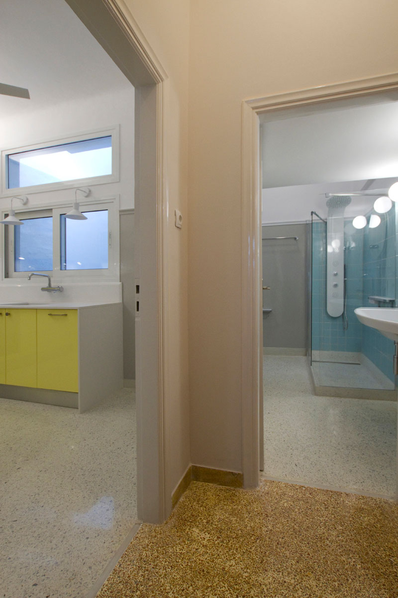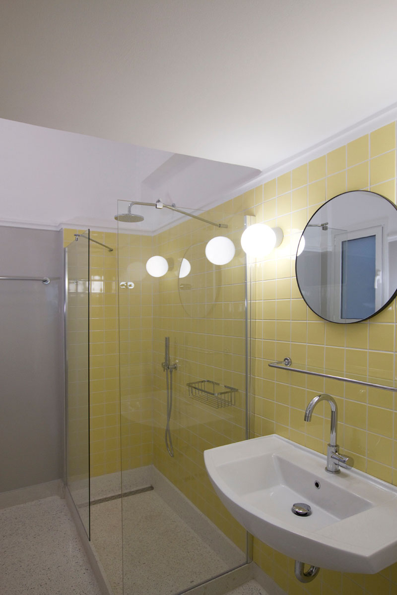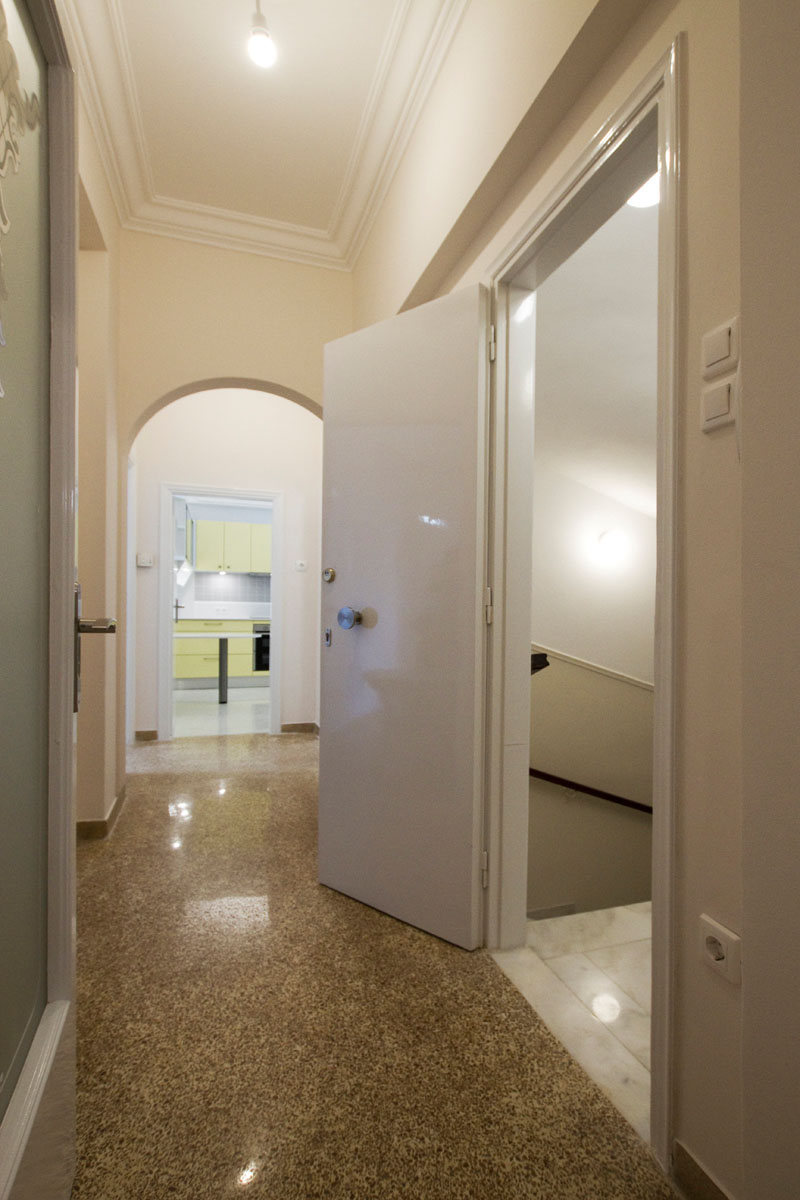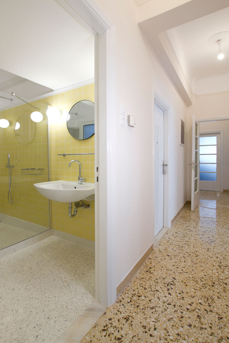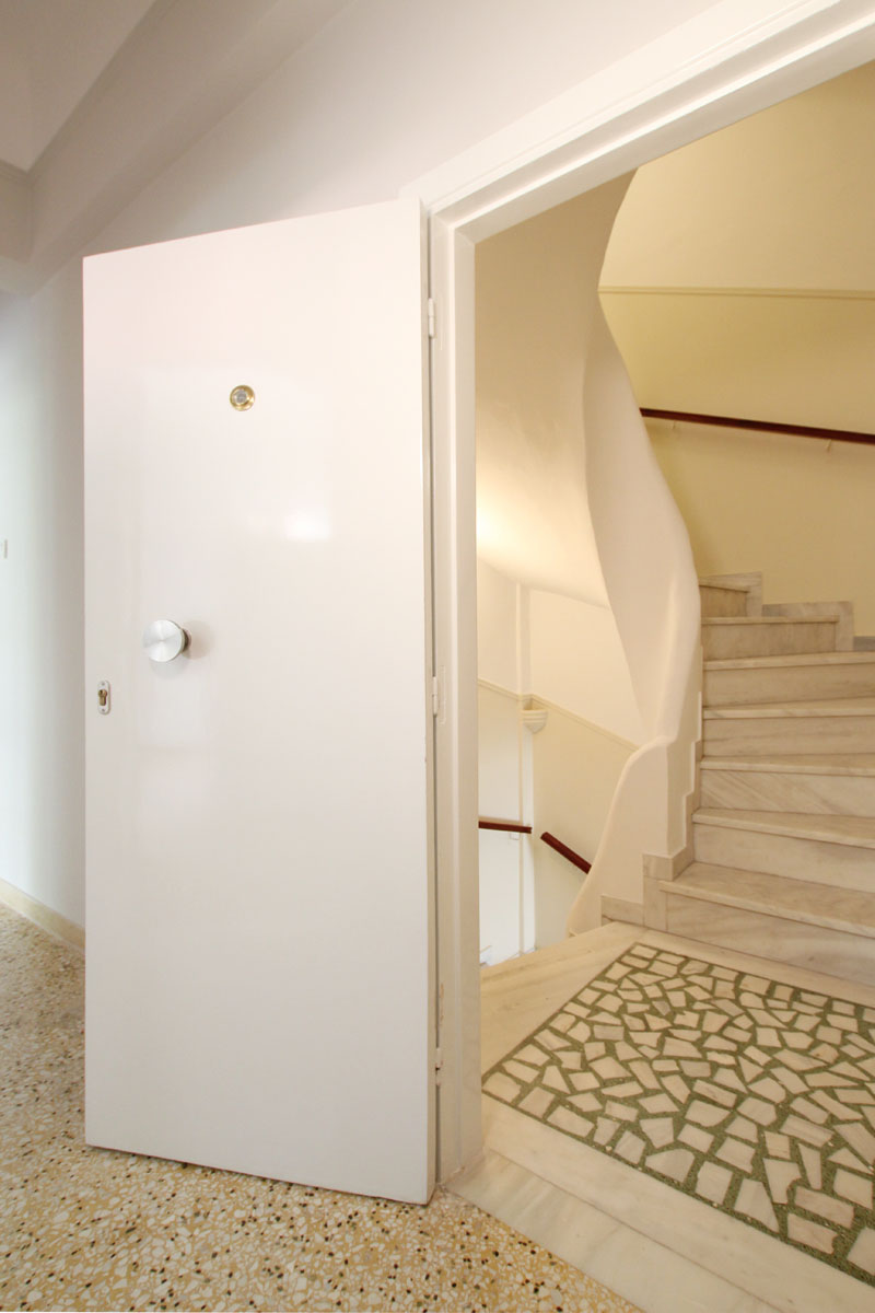 We have completely renovated the apartments, including the roof floor, which is regularly used as an open-air lounging area, as well as the stairwell and the façades. We renewed all electrical installations, sewage and water supply lines and renovated all bathrooms and kitchens. We preserved and repaired all marble and terrazzo surfaces, as well as all original wooden doors and floors. After replacing all water lines, we applied new terrazzo flooring to the bathrooms and kitchens.