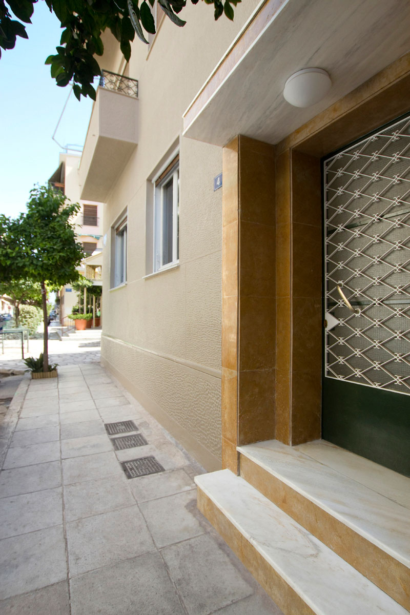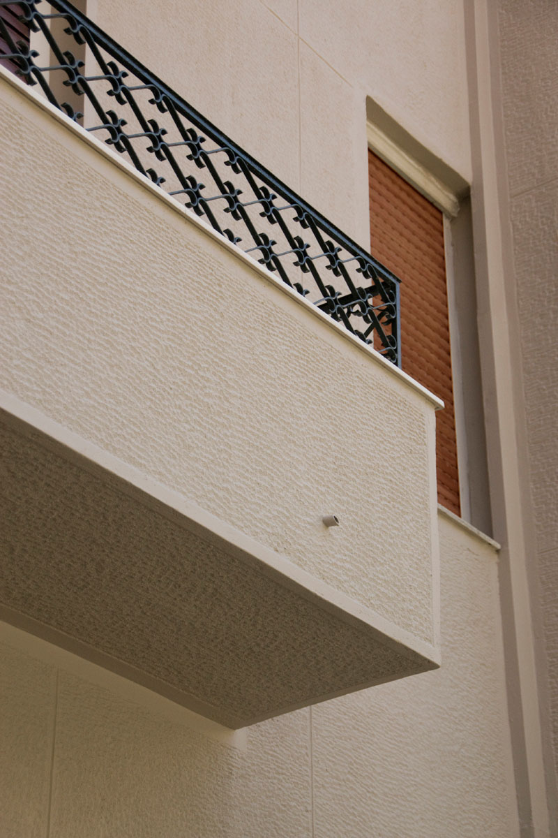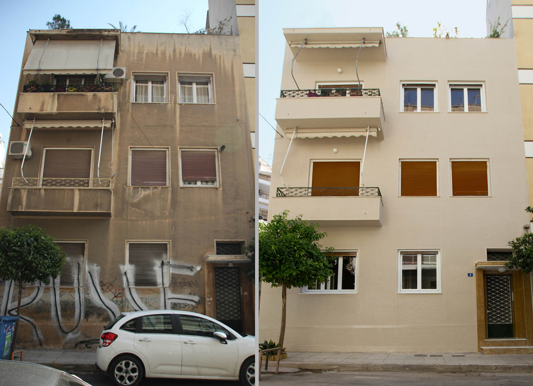 The original plaster of the façade is a pigmented hammered plaster of the type often used in Athenian apartment buildings up until the early 1970s. After a first clean up with water, we discovered that it was heavily contaminated in its mass, showing dark areas around cracks, under window sills etc. due to decades of exposure to air pollution, so we decided that painting would be the only reasonable treating for it.