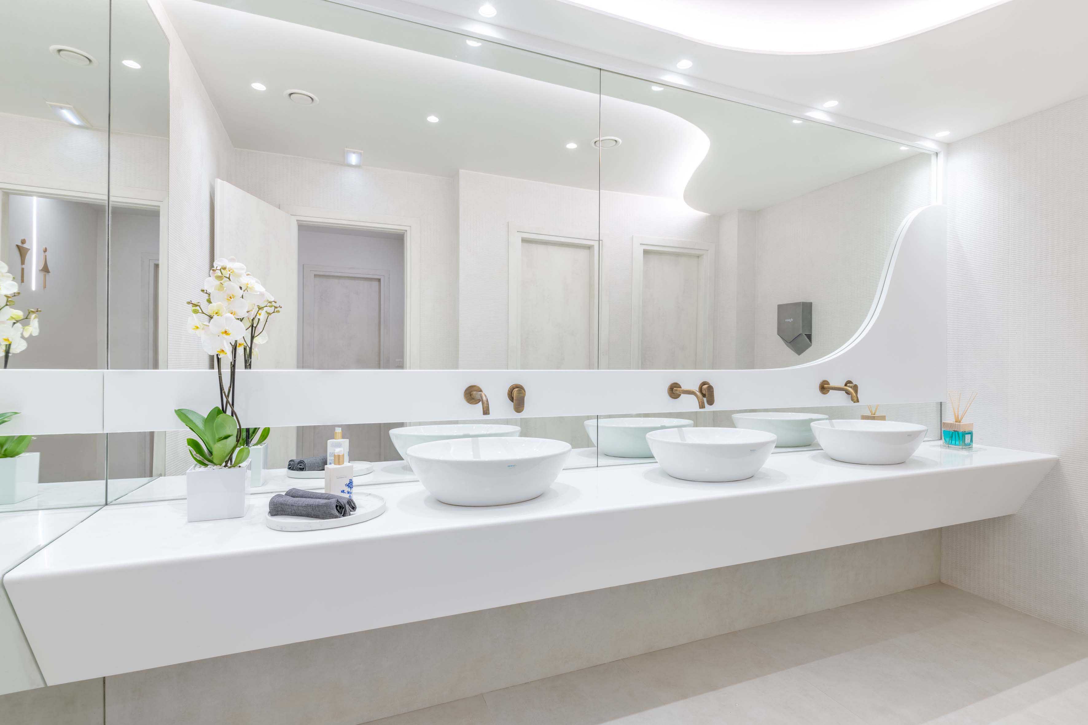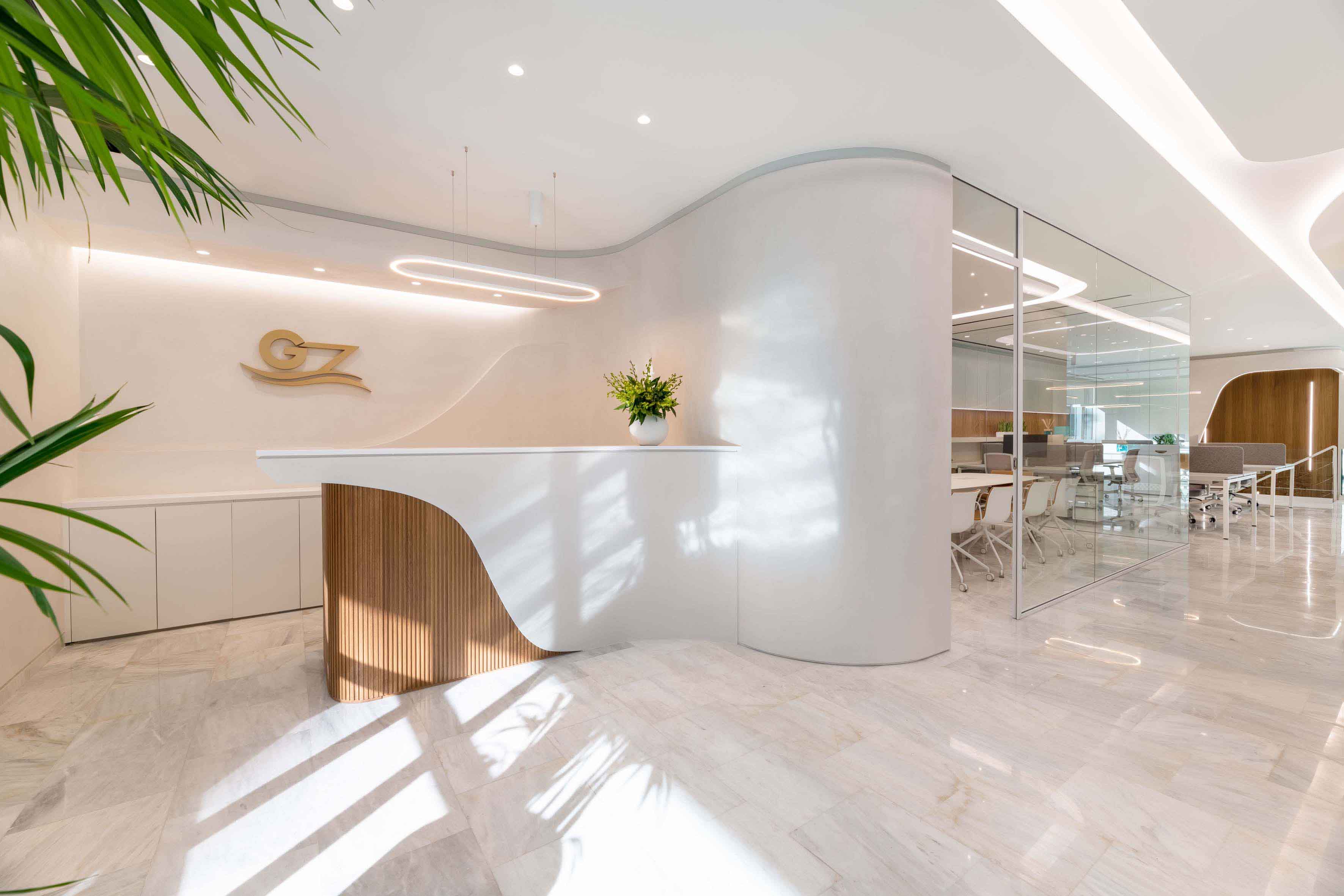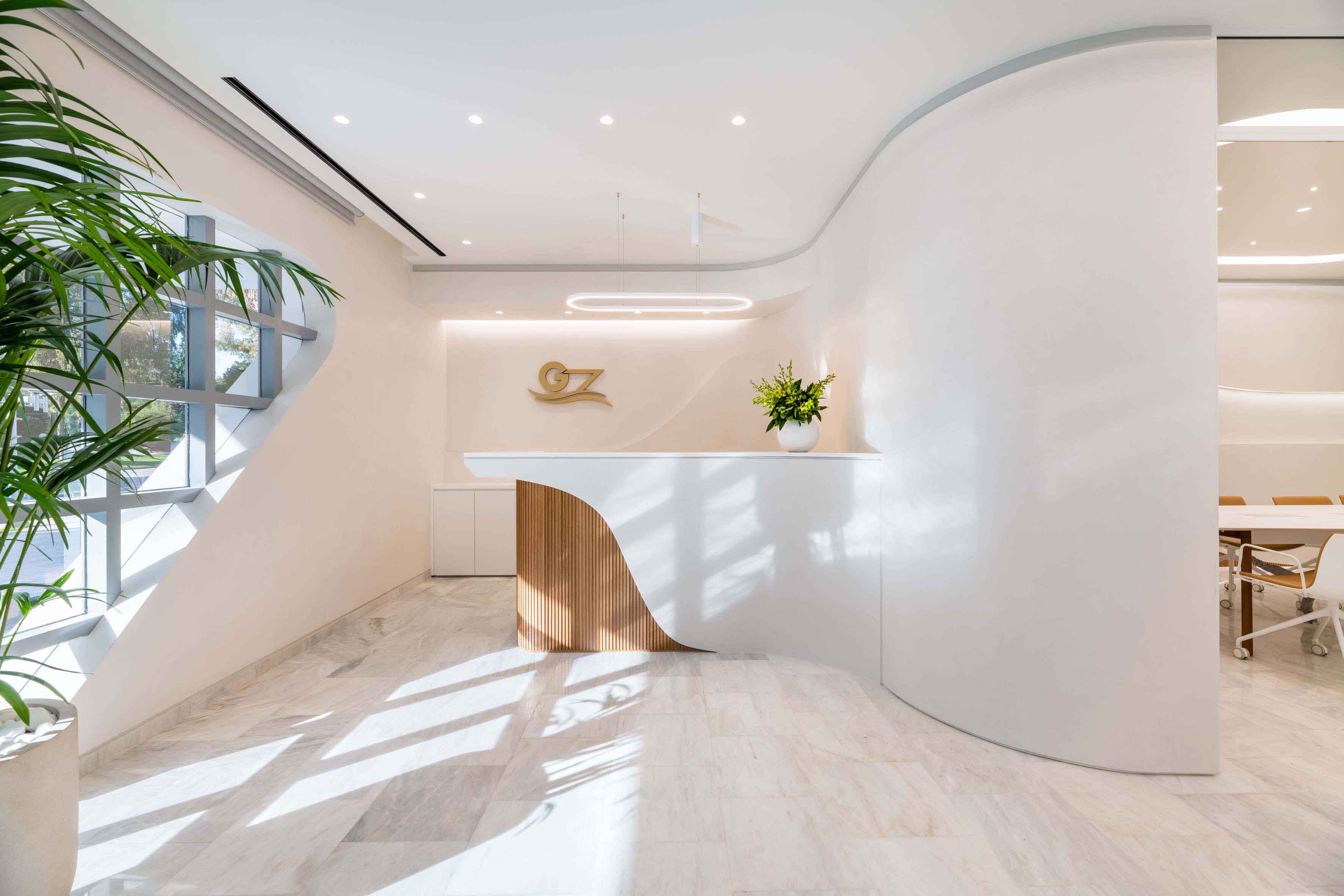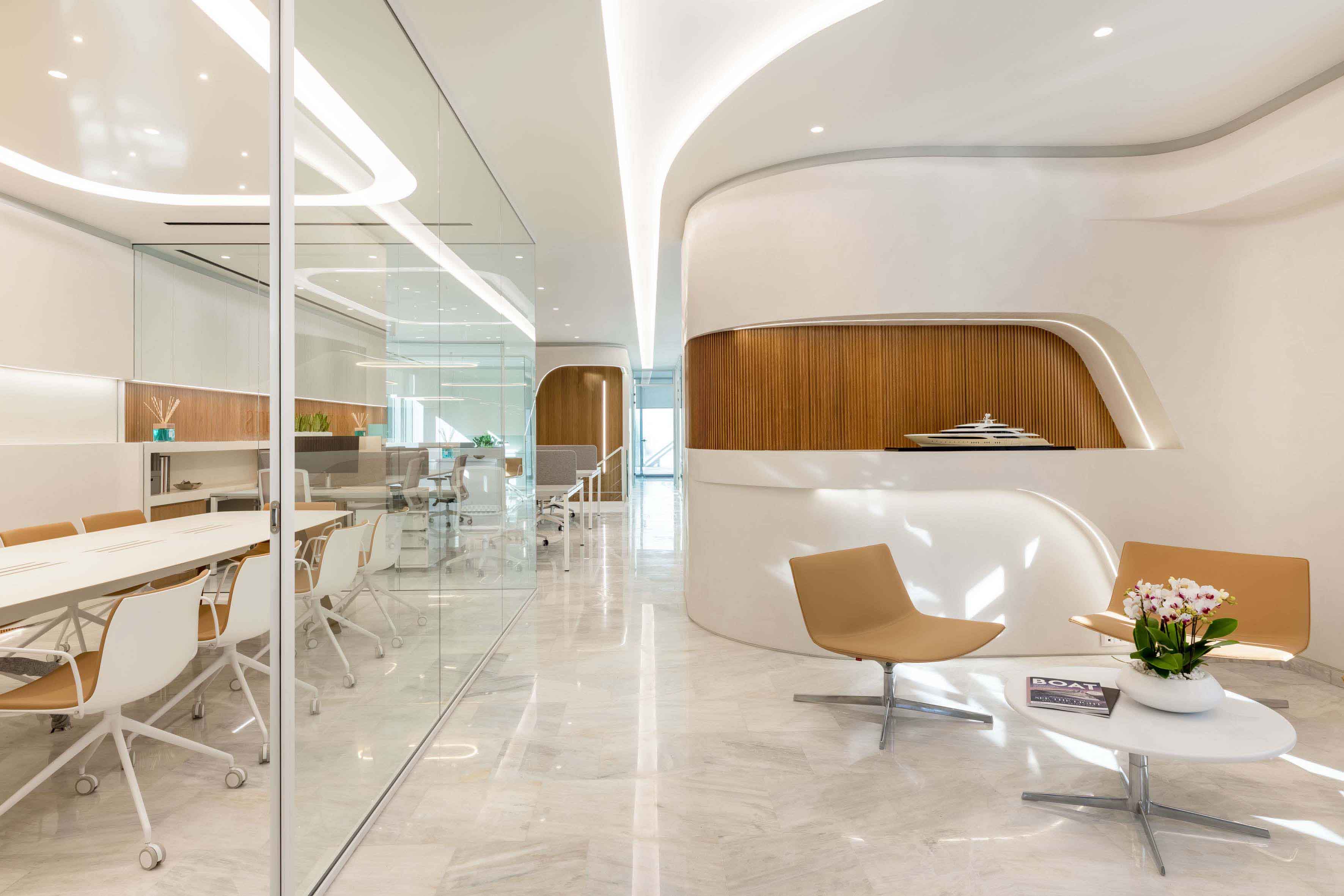 Κυρίαρχο στοιχείο του σχεδιασμού, που στοχεύει στο να συνδέσει οργανικά το σύνολο των λειτουργιών, ήταν η εφαρμογή ήπιων καμπύλων σχηματισμών και μιας ενιαίας και λιτής στο λεξιλόγιο παλέτας υλικών. Εμπνευσμένες από το σχεδιαστικό ύφος των yacht της εταιρείας, οι δυναμικές καμπύλες ενσωματώθηκαν στα διαχωριστικά στοιχεία, τις οροφές και τους τοίχους των χώρων ώστε να διαμορφώσουν ροές και καθαρές κινήσεις σπάζοντας την μονοτονία του αυστηρά ορθοκανονικού κανάβου του υφιστάμενου κελύφους.