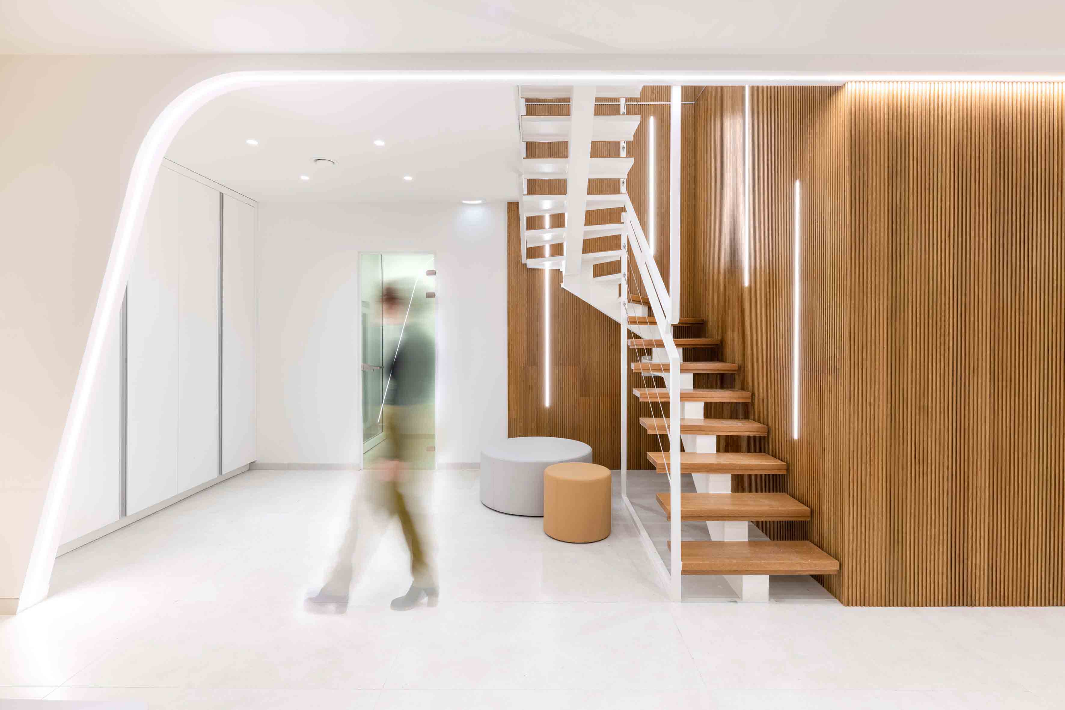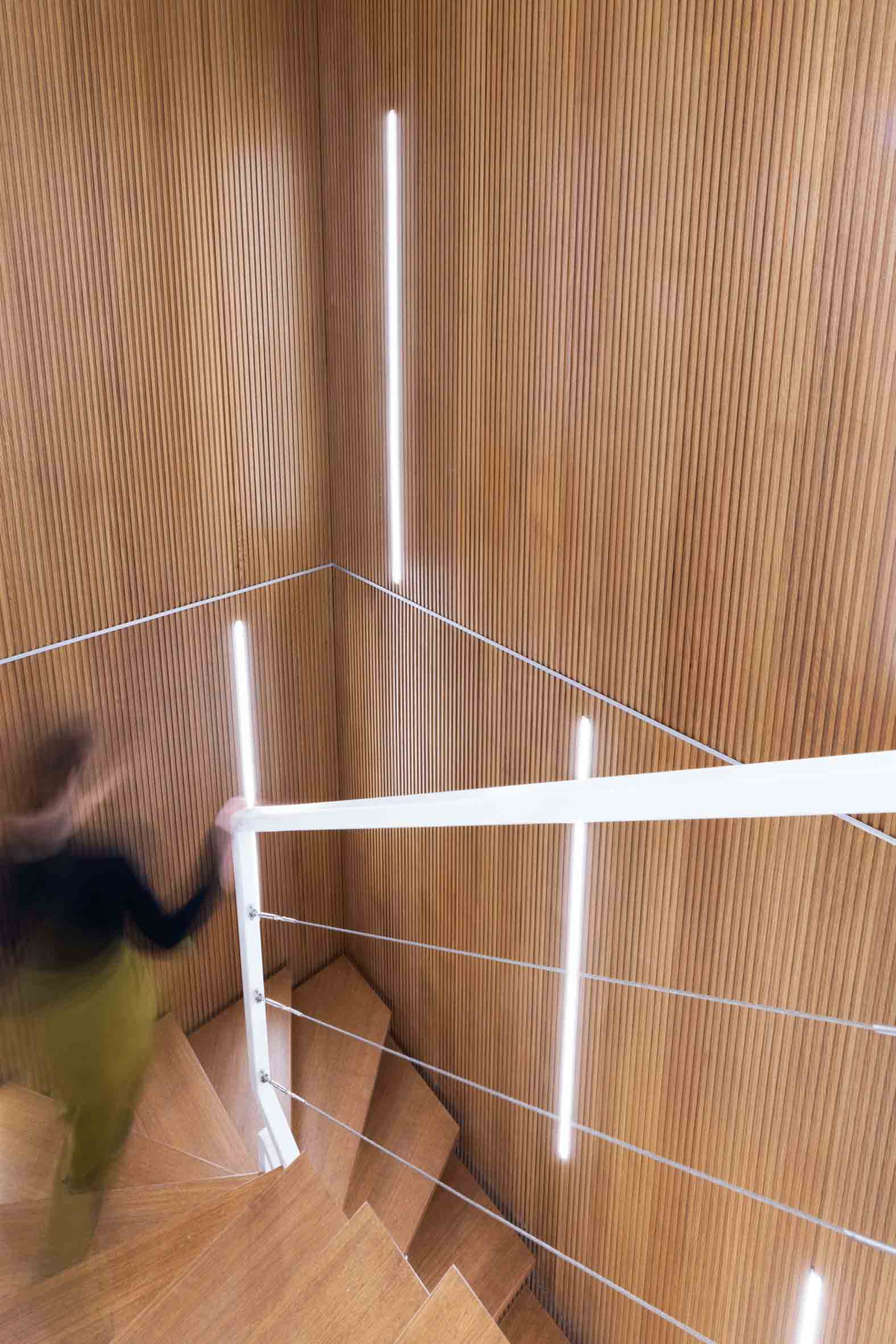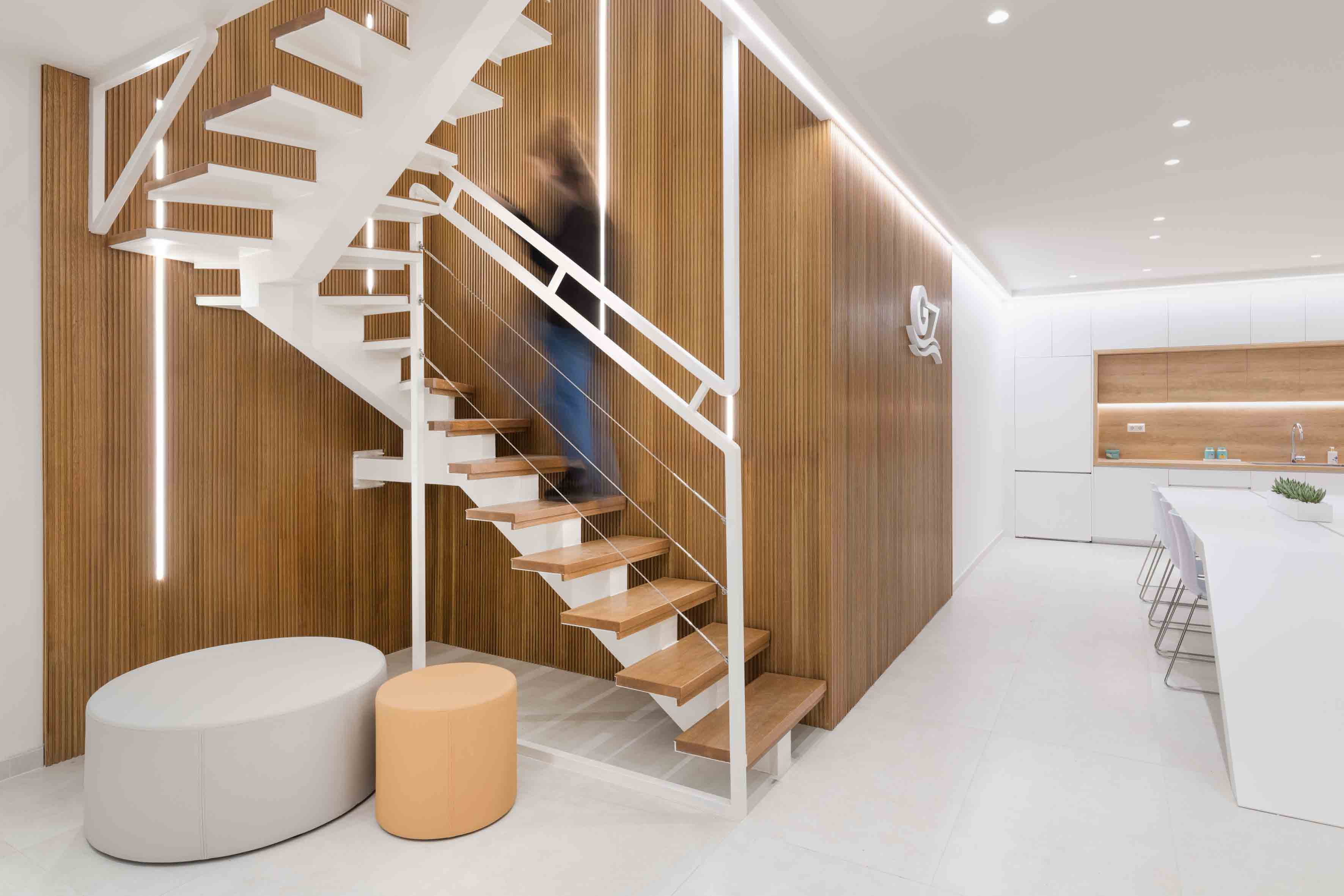 Κομβικό στοιχείο στην ενοποίηση του χώρου τόσο λειτουργικά όσο και σχεδιαστικά υπήρξε η εισαγωγή της νέας κεντρικής εσωτερικής σκάλας. Η ανάλαφρη μεταλλική βαθμιδοφόρος και τα δρύινα σκαλοπάτια αγκαλιάζονται από την επένδυση του τοίχου με φυσικό ξύλο, ενώ η γραμμικότητα της επένδυσης σε συνδυασμό με τον φωτισμό στοχεύουν στην ενίσχυση του κατακόρυφου άξονα του σημείου. Το σύνολο των υλικών και κυρίως η χρήση συρματόσχοινων στο κιγκλίδωμα έχει άμεσες αισθητικές και λειτουργικές αναφορές στον σχεδιασμό σκαφών και δρα ως σύνδεσμος ανάμεσα στα δύο επίπεδα και την αισθητική τους συνέχεια, παρά την λειτουργική τους διαφοροποίηση.
