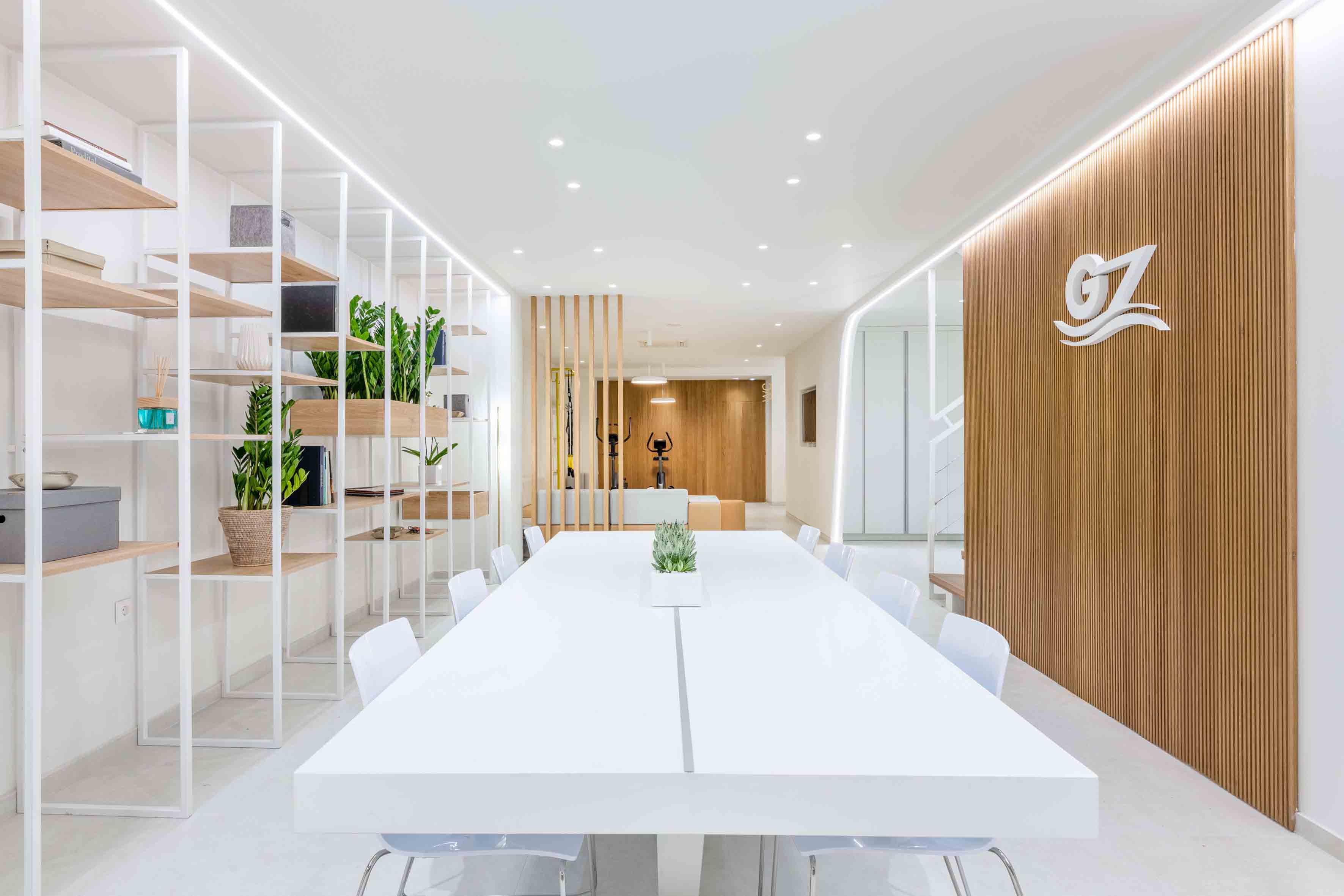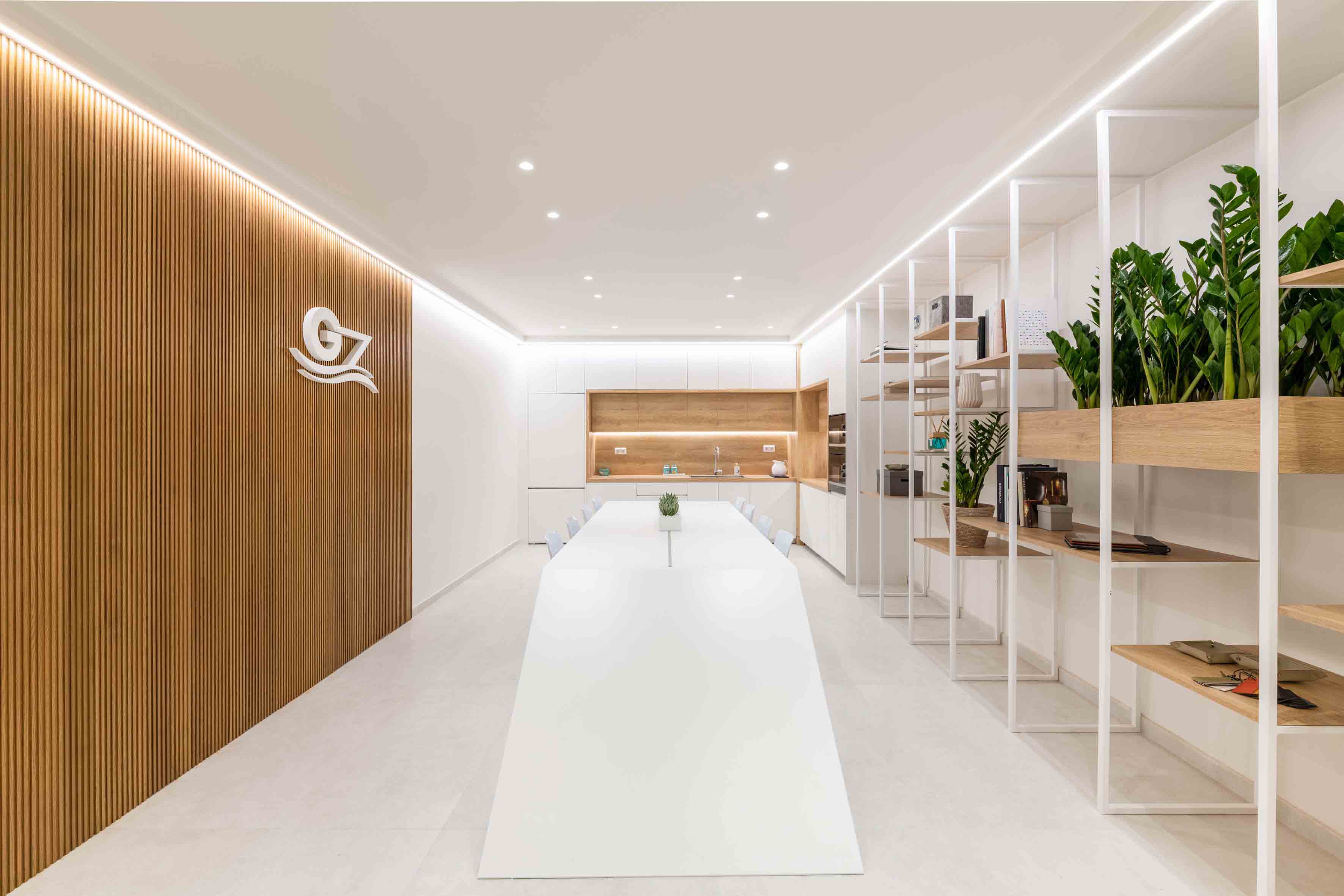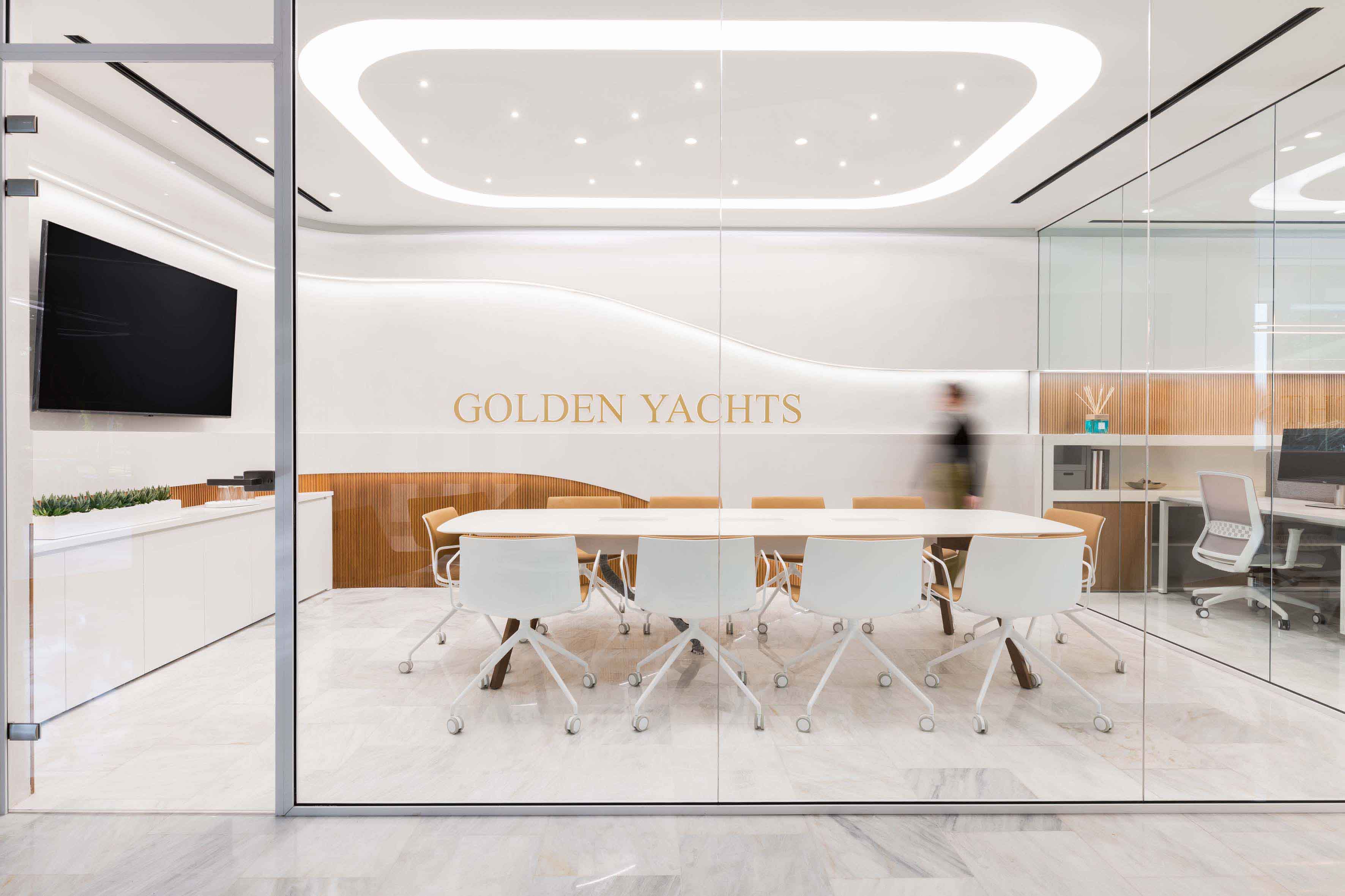 Το γωνιακό διώροφο κατάστημα, που προηγουμένως φιλοξενούσε χώρο γραφείων τράπεζας, επανασχεδιάστηκε για να στεγάσει τα νέα γραφεία της Golden Yachts. Τα δύο επίπεδα οργανώνονται διακριτά, καθώς στο ισόγειο συναντάται η κύρια είσοδος με την υποδοχή, η αίθουσα συσκέψεων και όλοι οι χώροι γραφείων, ενώ στο υπόγειο βρίσκονται οι κοινόχρηστοι και οι βοηθητικοί χώροι (διαλείμματος, φαγητού, γυμναστικής, υγιεινής και αποθήκευσης).