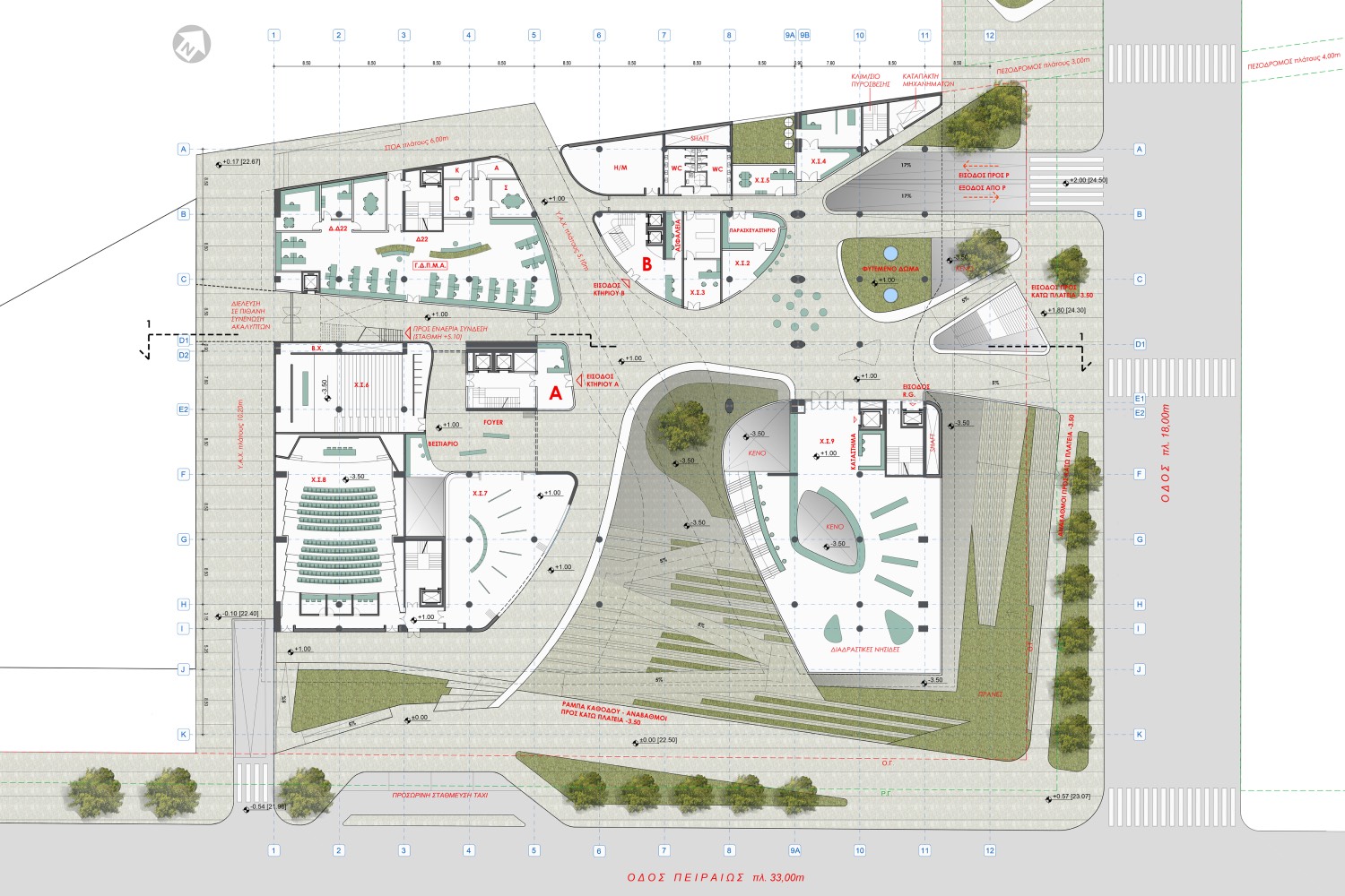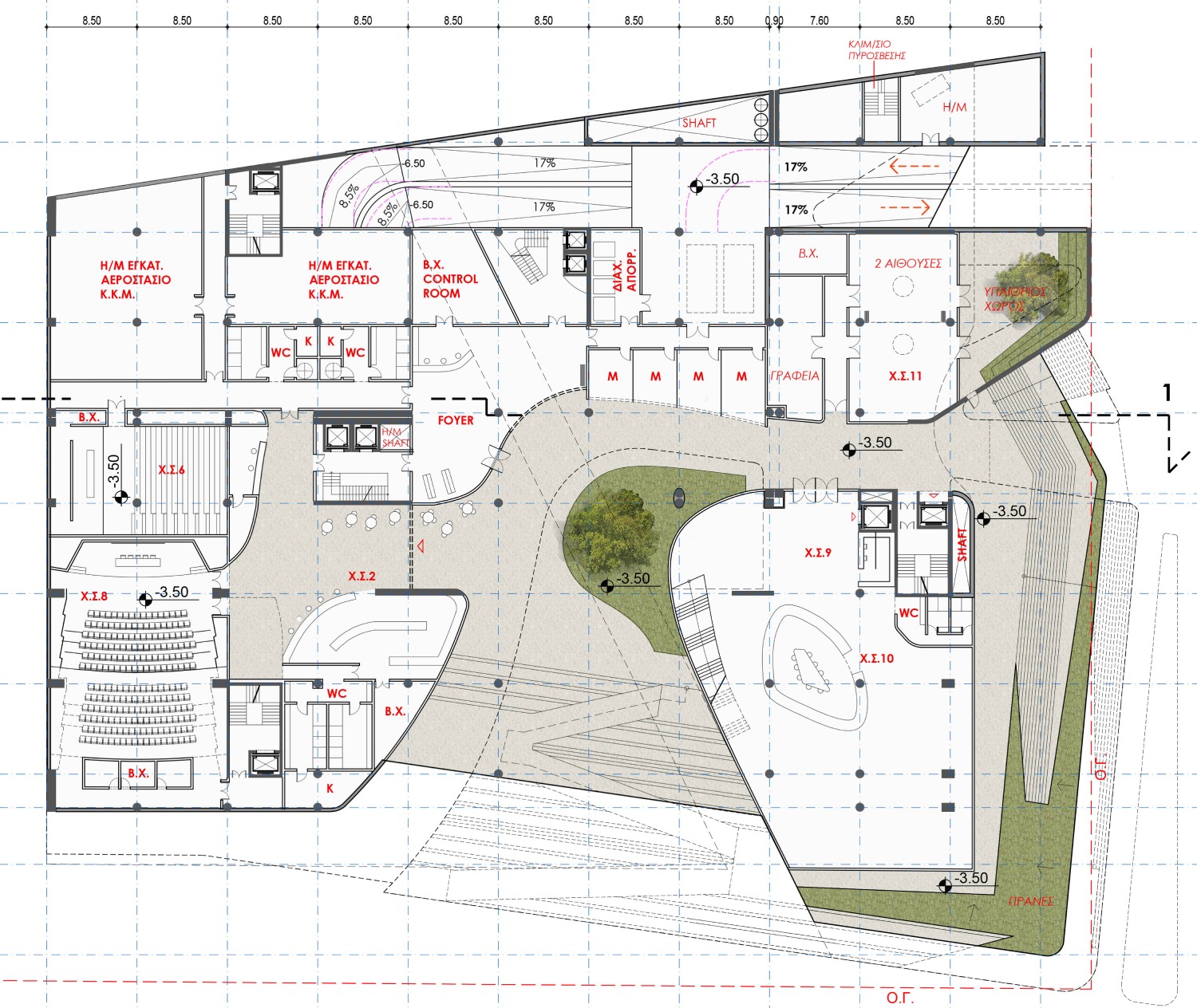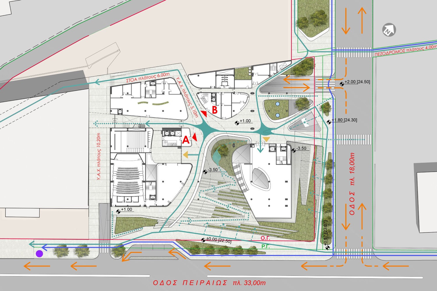 Η κύρια στάθμη εισόδου - "κάτω πλατεία" διαμορφώνεται σε υποβάθμιση ως προς τον περιβάλλοντα αστικό χώρο, αλλά σε συνέχεια του τοπιακού αναγλύφου μέσω πρανών και αναβαθμών και στα δύο αστικά μέτωπα. Η δημόσια λειτουργία τής "κάτω πλατείας" ενισχύεται με χώρους συνάθροισης κοινού -Μουσείο & Αμφιθέατρο.