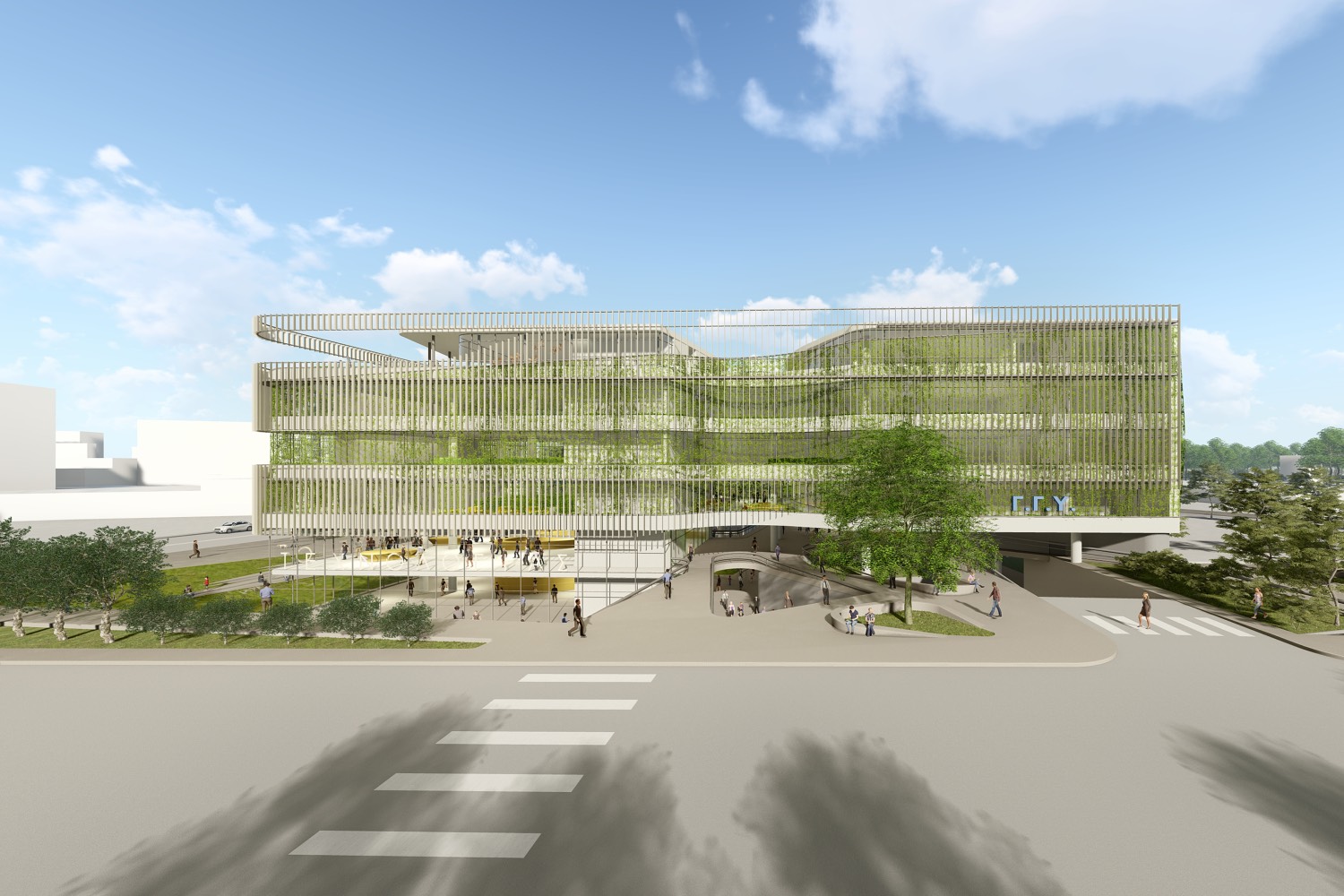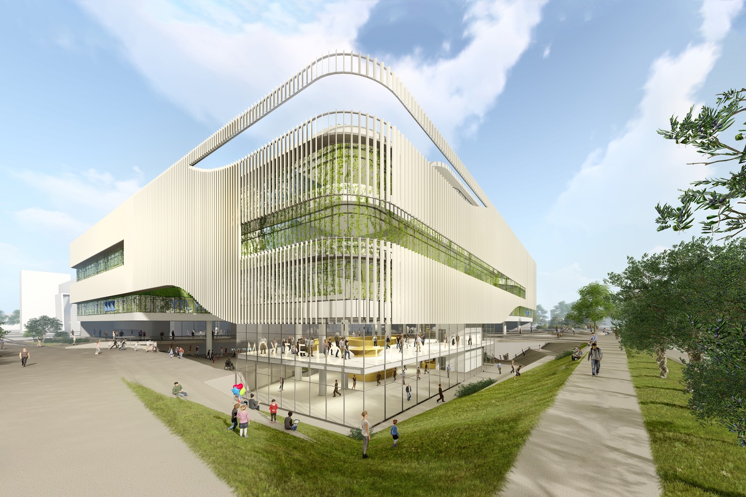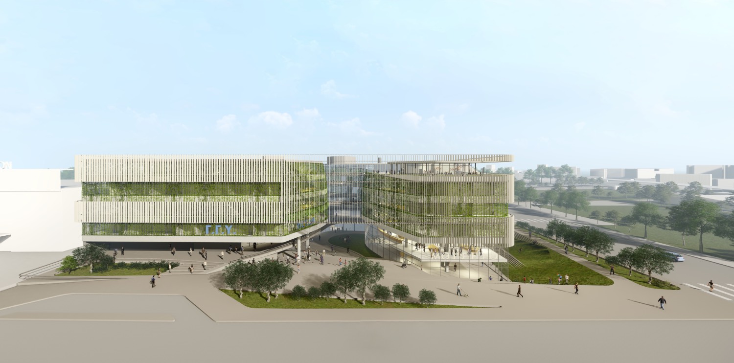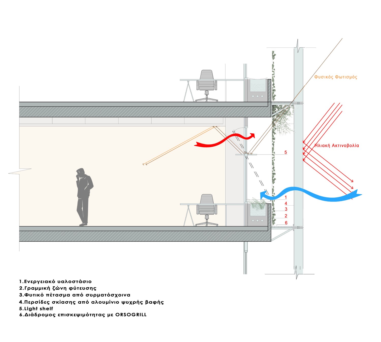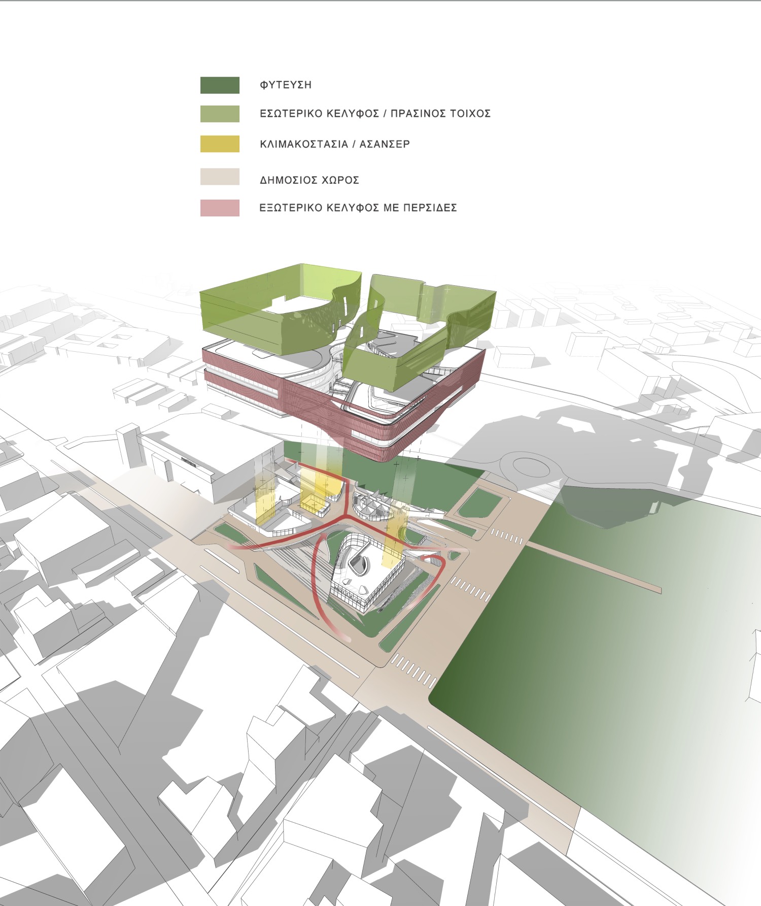 Βιοκλιματική συγκρότηση του κτιριακού κελύφους με εγγραφή σε πρόβολο ενός σχήματος αντιληπτικά ισχυρού, ενός "διπλού" βιοκλιματικού πετάσματος.