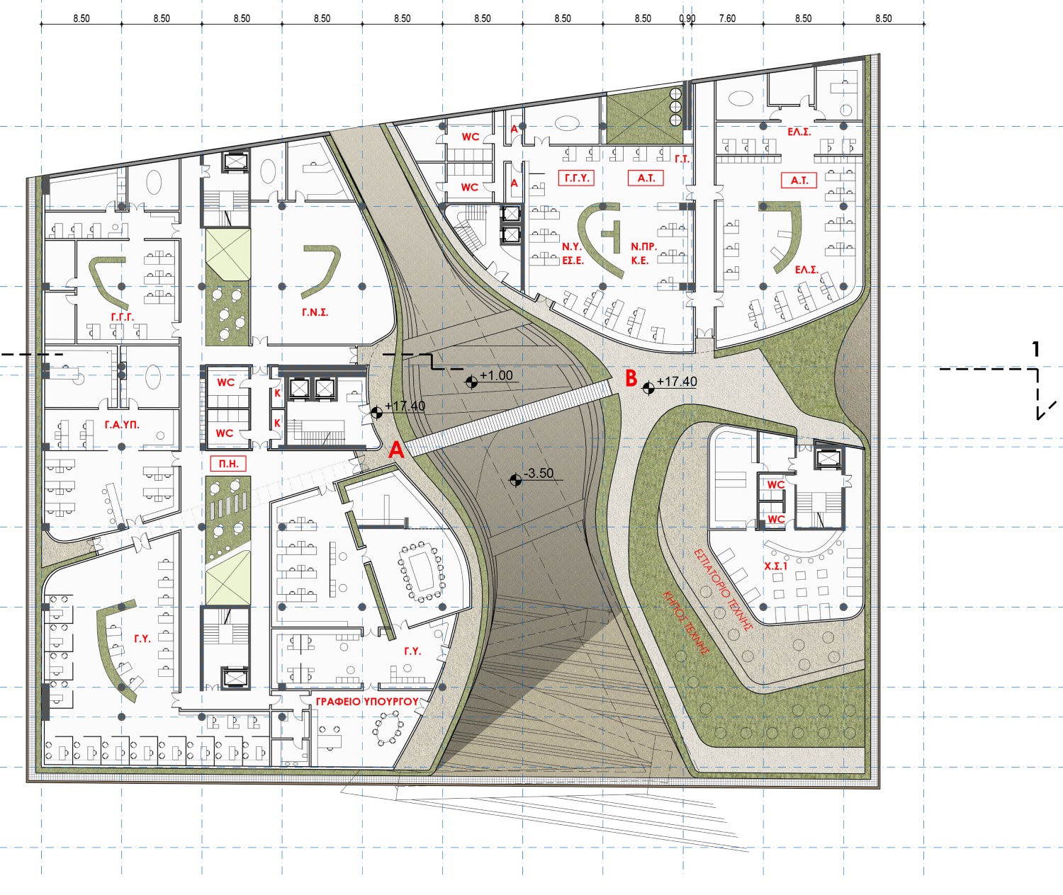 Στις ανώτερες στάθμες γραφειακών χρήσεων, οι μεταβατικές περιοχές κινήσεων, εκτόνωσης και επικοινωνίας, ορίζονται από τα κυρίαρχα συνθετικά φυτικά πετάσματα, ως προς το κεντρικό αίθριο.