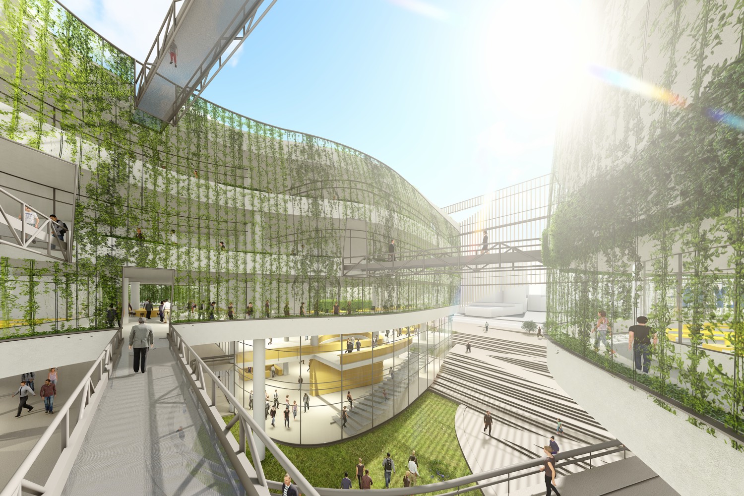 Η εσώτερη διαπερατή επιδερμίδα αντιστοιχεί σε φυτικό πέτασμα ανοξείδωτου Αρχιτεκτονικού πλέγματος αναρρίχησης φυτών, που περιελίσσεται γύρω από τις εξωτερικές υάλινες επιφάνειες και εισχωρεί εντός της αιθριακής σχισμής, παρακολουθώντας τις εσωτερικές καμπυλώσεις του κτηρίου.
