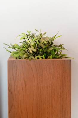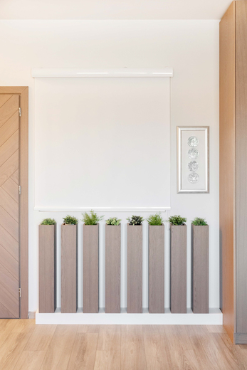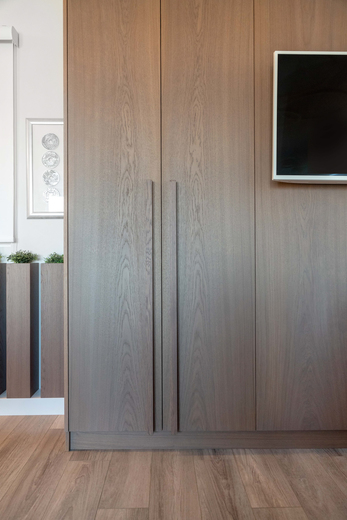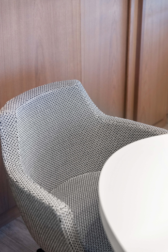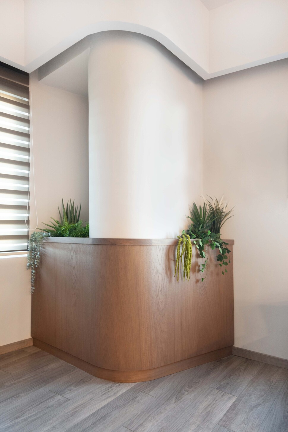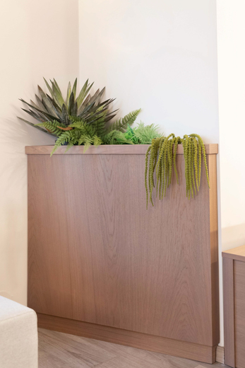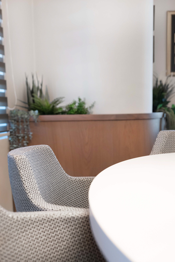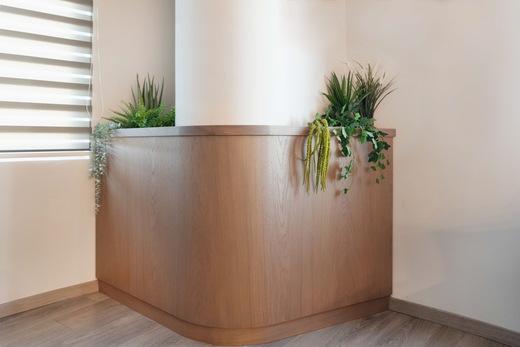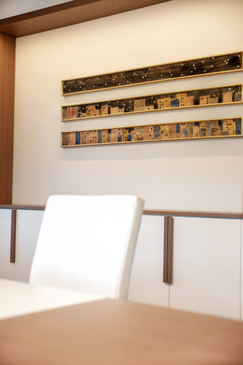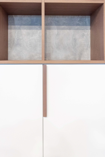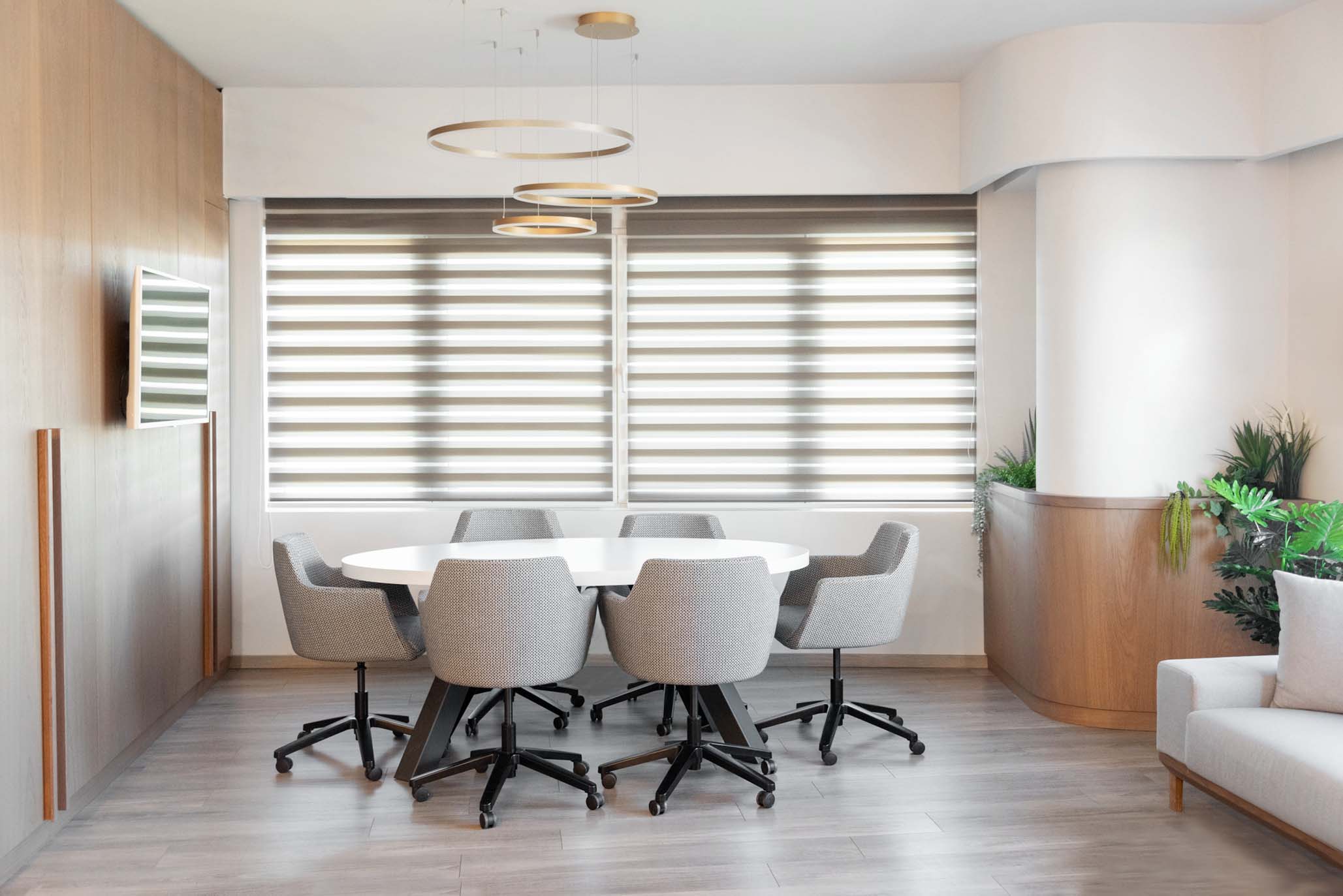 Οι μεγάλες κυκλικές κολώνες, οι οποίες αποτελούν μέρος του φέροντος οργανισμού του κτηρίου, αποτέλεσαν μια πρόκληση σε σχέση με τον σχεδιασμό που θέλαμε να πετύχουμε. Για να αντιμετωπιστεί αυτή η δυσκολία, προσπαθήσαμε οι κολώνες να ενταχθούν στον σχεδιασμό. Στη μια πλευρά τού meeting table, η μεγάλη ξύλινη κατασκευή λειτουργεί ως χώρος αποθήκευσης με πόρτες ανοιγόμενες σε όλο το ύψος, κρατώντας σταθερό το κεντρικό σημείο της στο οποίο εντοιχίζεται μια από τις μεγάλες κυκλικές κολώνες. Στην απέναντι πλευρά, οι κολώνες επενδύονται με καπλαμά από ξύλο δρυός, δημιουργώντας χώρο για διακοσμητικά φυτά.