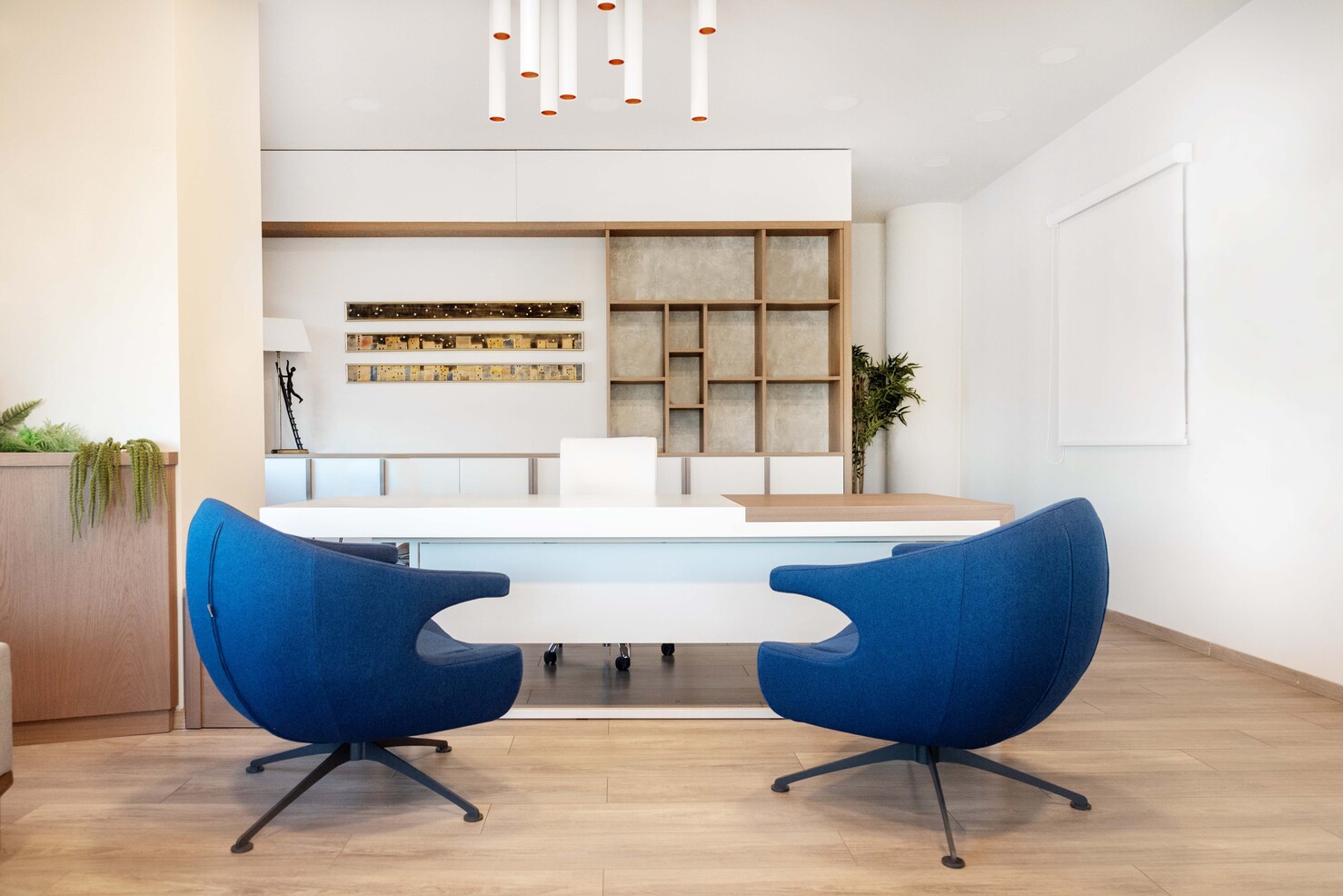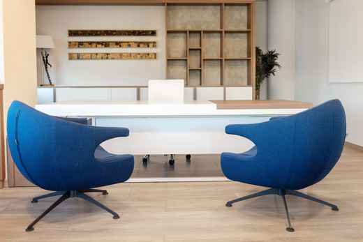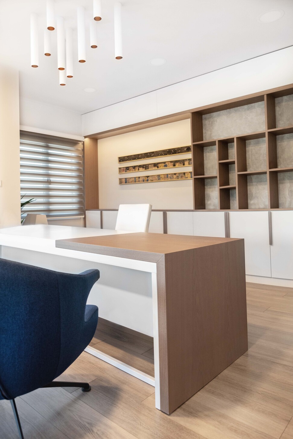 Σημαντικό ζητούμενο ήταν η δημιουργία ενός χώρου, ο οποίος θα είναι επαγγελματικά άρτιος καλύπτοντας τις ανάγκες του ιδιοκτήτη μεμονωμένα, αλλά και ενσωματώνοντας ταυτόχρονα ένα meeting table ως το σημείο αλληλεπίδρασής του με τους πελάτες. Η μεγάλη βιβλιοθήκη πίσω από το γραφείο, πέρα από το χρηστικό μέρος της αποθήκευσης, λειτουργεί και ως διαχωριστικό, δημιουργώντας έναν διάδρομο που οδηγεί στον χώρο του WC, το οποίο δημιουργήθηκε μέσα στα πλαίσια της αυτονομίας του χώρου. Στην εσωτερική πλευρά του γραφείου δημιουργήθηκαν δυο παράθυρα με γυαλί triplex και μεμβράνη καθρέπτη, με σκοπό το γραφείο να έχει την αίσθηση της ιδιωτικότητας και της ηχητικής και οπτικής απομόνωσης από τα διπλανά γραφεία, ενώ ταυτόχρονα διατηρεί την οπτική επαφή με τον χώρο του λογιστηρίου και της γραμματέως.