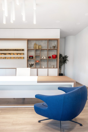 Περιμετρικοί κρυφοί φωτισμοί τοιχοποιίας, φωτιστικά οροφής και κρυφός φωτισμός στη σύνθεση της βιβλιοθήκης, αναδεικνύουν τη σχεδιαστική γραμμή δημιουργώντας ένα ξεκούραστο και ευχάριστο περιβάλλον εργασίας.