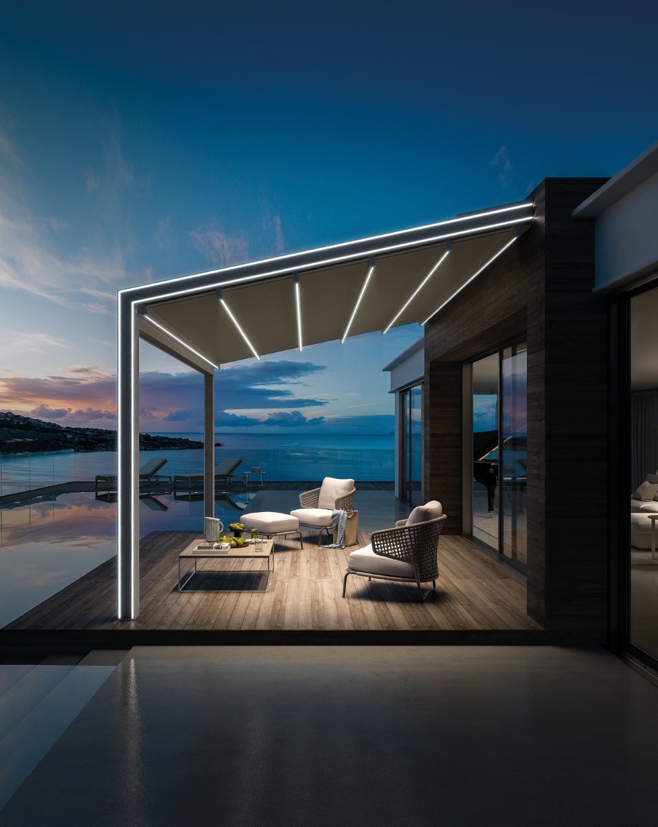 Το Gennius Vega, το νέο σύστημα εξωτερικής πέργκολας με γραμμικό σχεδιασμό, χαρακτηρίζεται από τα καινοτόμα ένθετα φωτός. Η αναδιπλούμενη οροφή στερεώνεται σε ένα σύστημα προφίλ και οδηγών εγκάρσιας ράβδου και το σύστημα επιτρέπει οριζόντια ολίσθηση.